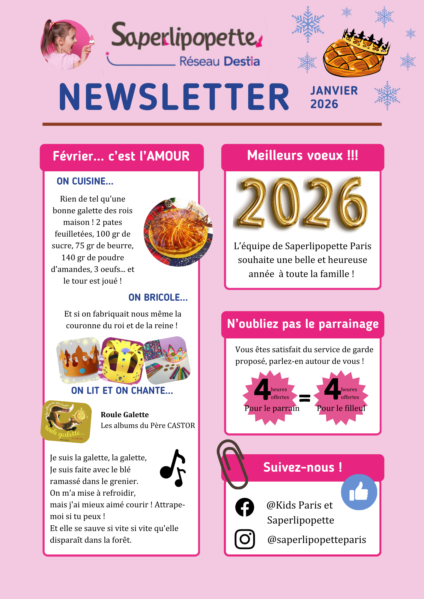 • Nous apprécions beaucoup les outils pédagogiques mis à disposition par l’agence (Newsletter, activités d’éveil sur les réseaux sociaux…) Notre baby-sitter a participé à plusieurs formations durant l’année et a été conseillée lors de visites de suivi. Cela nous rassure et nous pousse à continuer avec Saperlipopette.